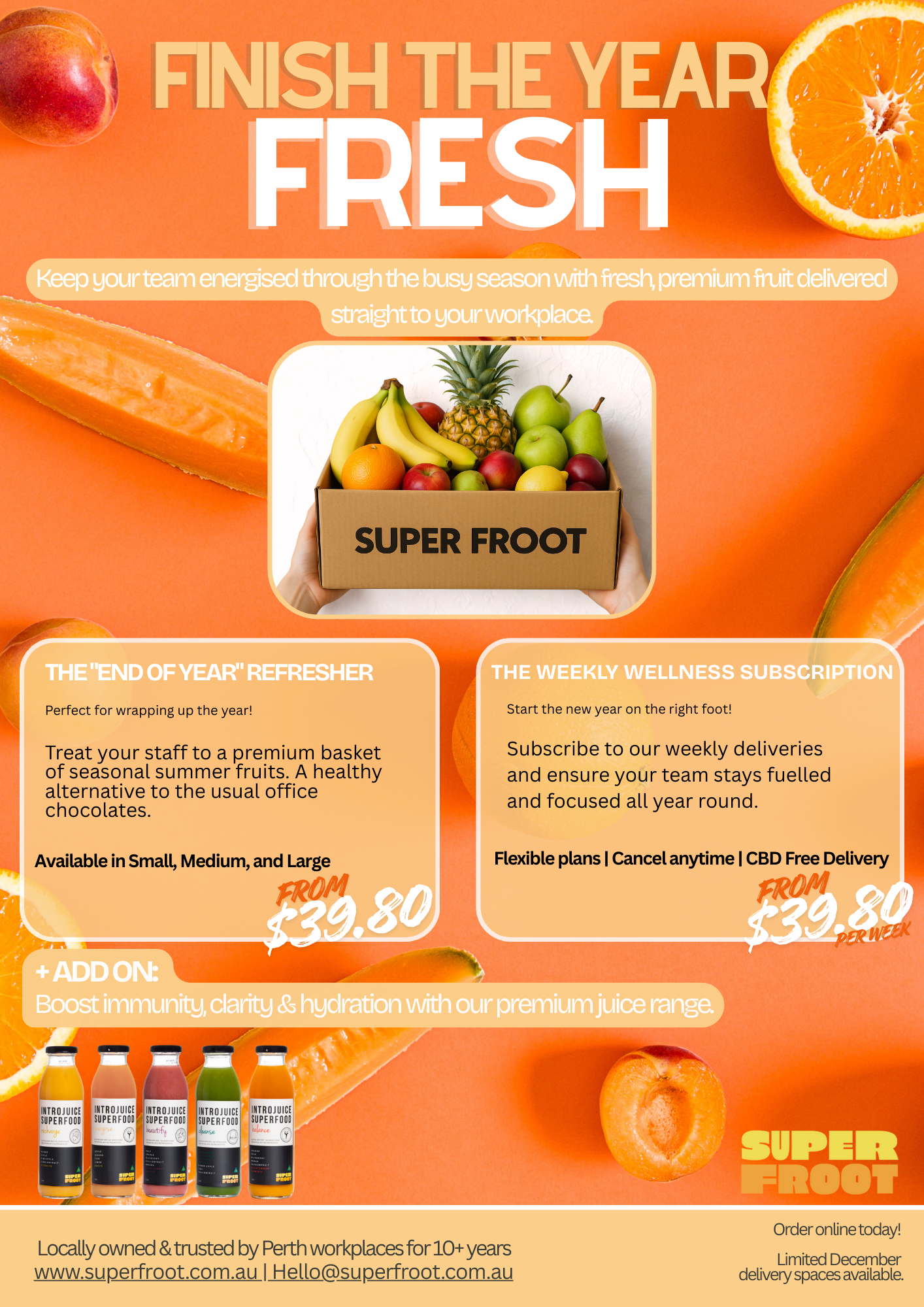 Fresh fruit baskets delivered across Perth, fast, fresh, and guaranteed to impress your team.